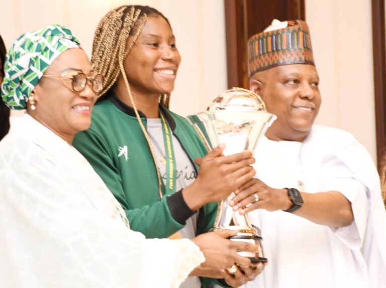 First Lady, Senator Oluremi Tinubu and Vice President Shettima during the reception for Nigeria D’Tigress, 2025 FIBA Women ‘s Afrobadlet Championship at the Presidential Villa in Abuja.