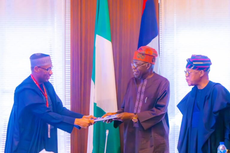 President Bola Tinubu receives the report of the High Powered Presidential Committee (HPPC) on Nigeria’s Extended Continental Shelf Project at the State House, Abuja.