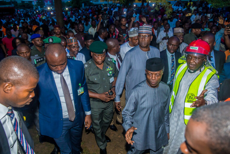 Acting President Yemi Osinbajo Visits Collapsed Building Site The Acting President visited the site of a collapsed building at Utako, Abuja to inspect level of damage. He was flanked by the Minister of FCT Mohammed Bello, SGF Boss Mustapha and a FEMA Official