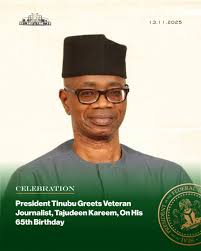 President Bola Tinubu congratulates Chief Tajudeen Ayodeji Kareem, a prominent journalist and communication strategist, on his 65th birthday, which falls on November 14, 2025. With over 40 years of experience in journalism, strategic media management, and public policy analysis, Kareem is currently the Executive Director of Public Sector and Strategy at the Nigerian Capital Development […]