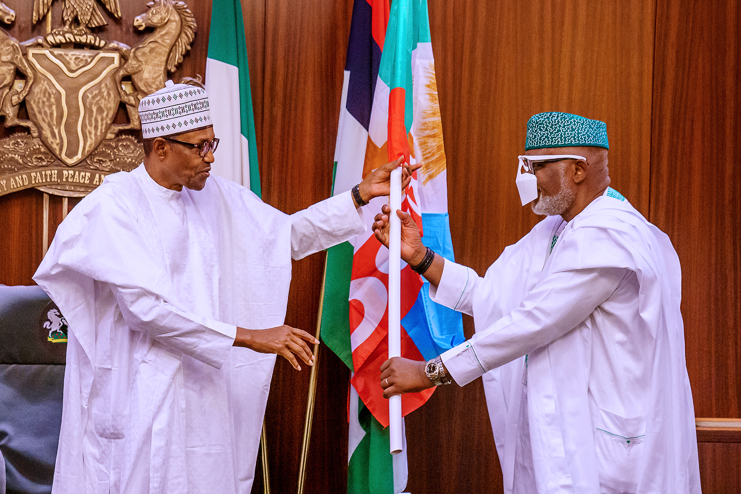 President Muhammadu Buhari presents APC Party Flag to Ondo State Governor Rotimi Akeredolu at the State House, Abuja.