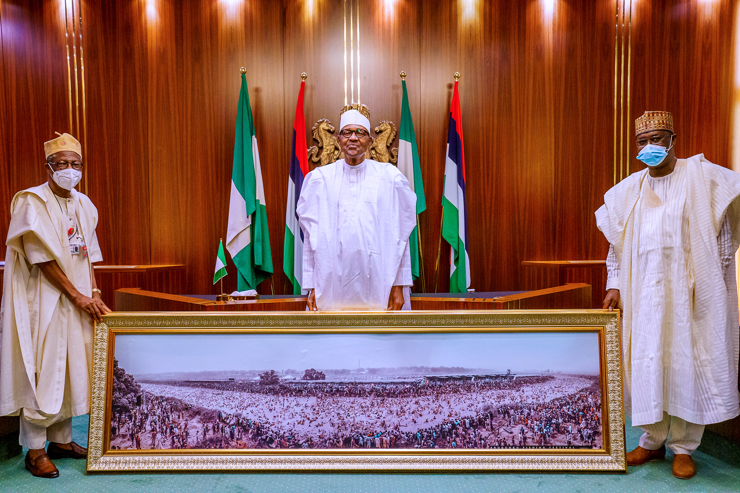 President Muhammadu Buhari with the Minister of Information and Culture, Lai Mohammed and the Minister of Water Resources, Suleiman Adamu as he receives a framed image of the Popular Argungu Fishing Festival during the briefing from the Minister of Information at the State House, Abuja.