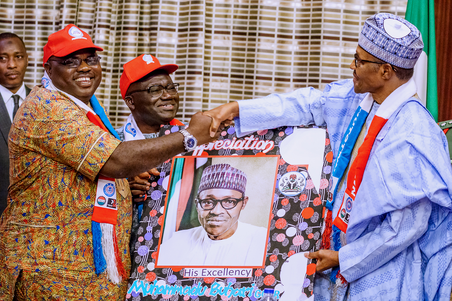 President Muhammadu Buhari received a presentation from President of NUTGT Mr John Adaji alongside Gen. Sec. Issa Aremu as he receives in courtesy visit from the National Executive of National Union of Textile, Garment and Tailoring Workers in State House, Abuja.