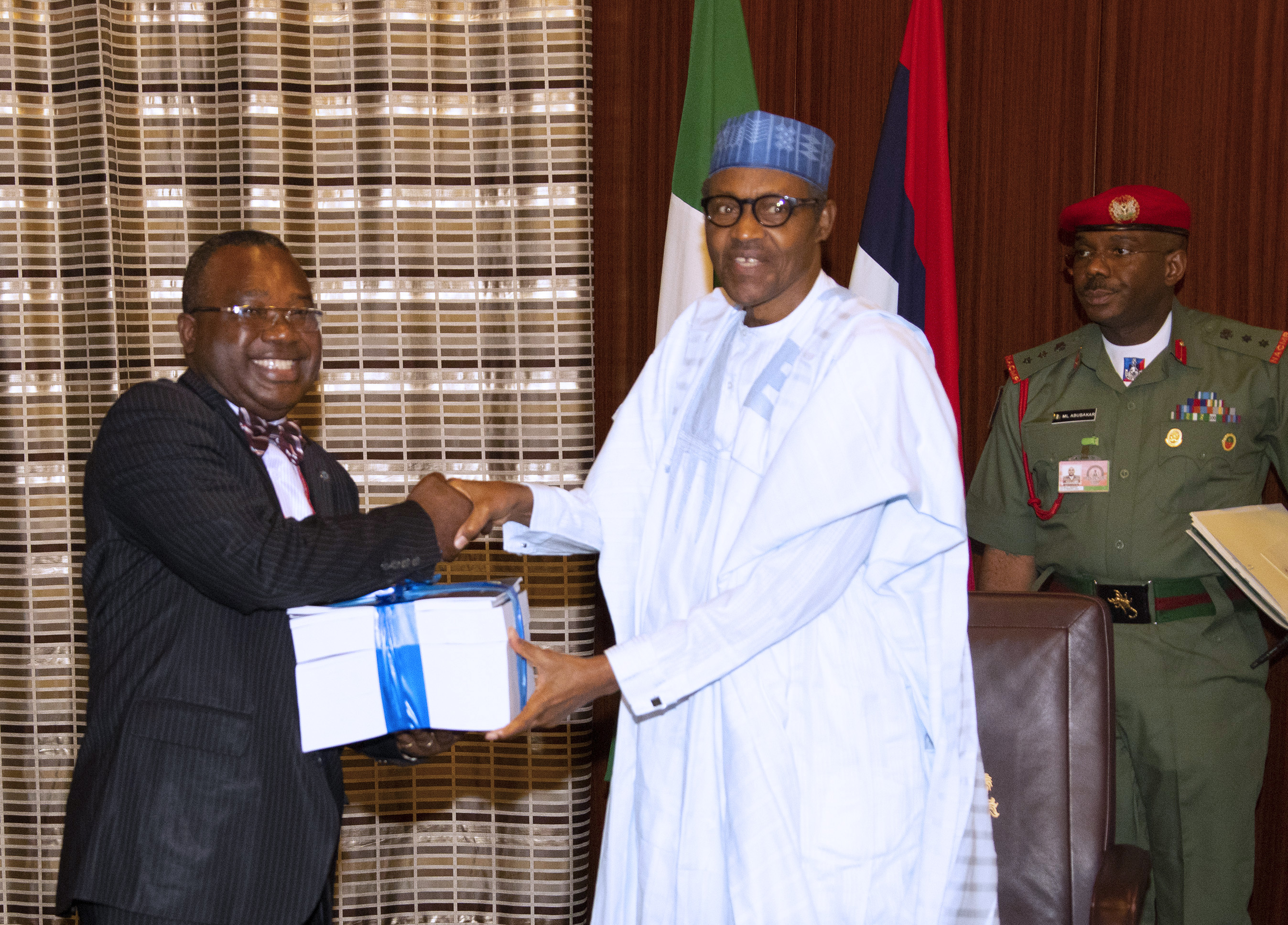 President Muhammadu Buhari receives Report of the Presidential Panel on Reform of the Special Anti-Robbery Squad SARS from Panel Chairman, Tony Ojukwu, at the State House Abuja. Vice President Yemi Osinbajo was also in attendance.