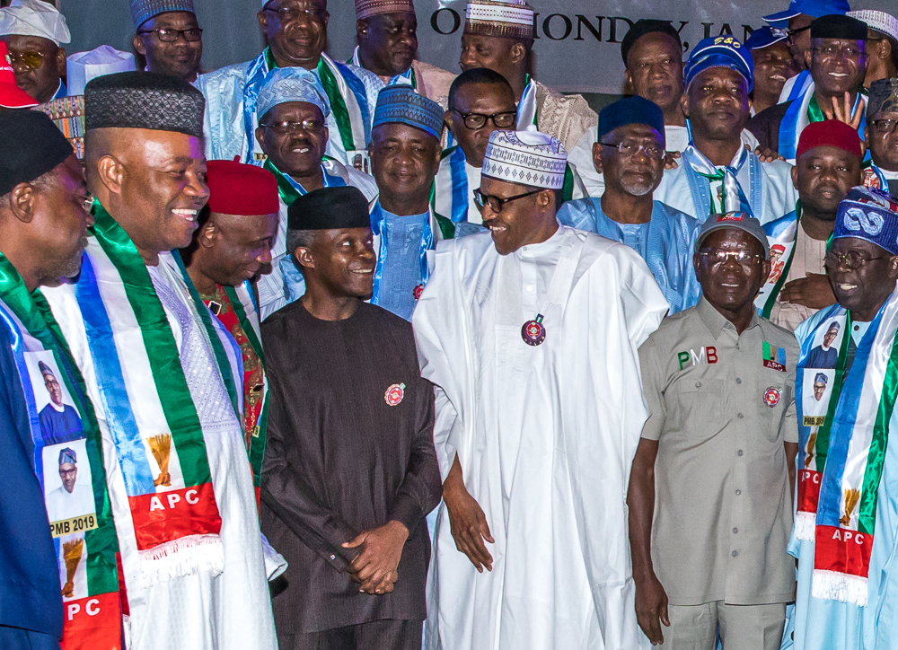 President Muhammadu Buhari inaugurates APC Presidential Campaign Council in Abuja. He was accompanied by Vice President, Yemi Osinbajo, National Leader of APC; Asiwaju Bola Ahmed Tinubu, National Chairman of APC; Adams Oshiomole, Secretary to the Government of the Federation; Boss Mustapha, APC Governors, Ministers and other Government Officials.