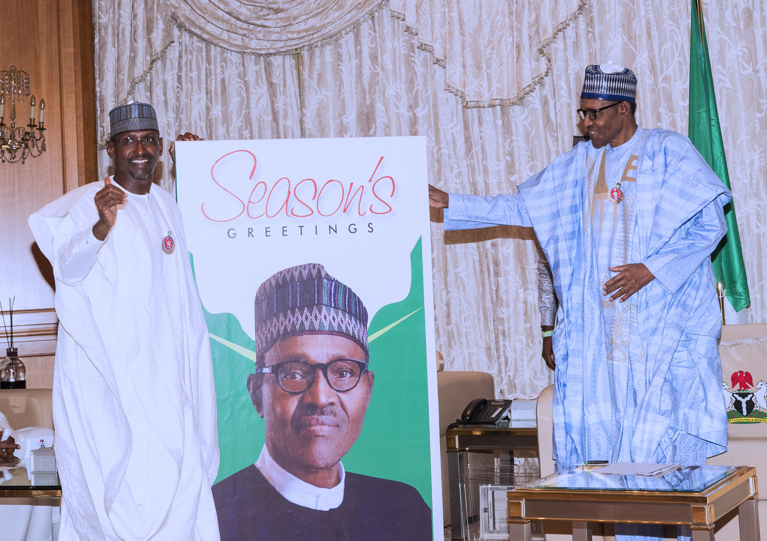 President Muhammadu Buhari received from the FCT Minister, Mallam Mohammad Musa Bello, a giant Christmas Card and an artistic Portrait frame and Christmas Card from the Chaplain, State House Chapel, Pastor Seyi Malomo during a Christmas Homage at the Residence, State House Abuja.