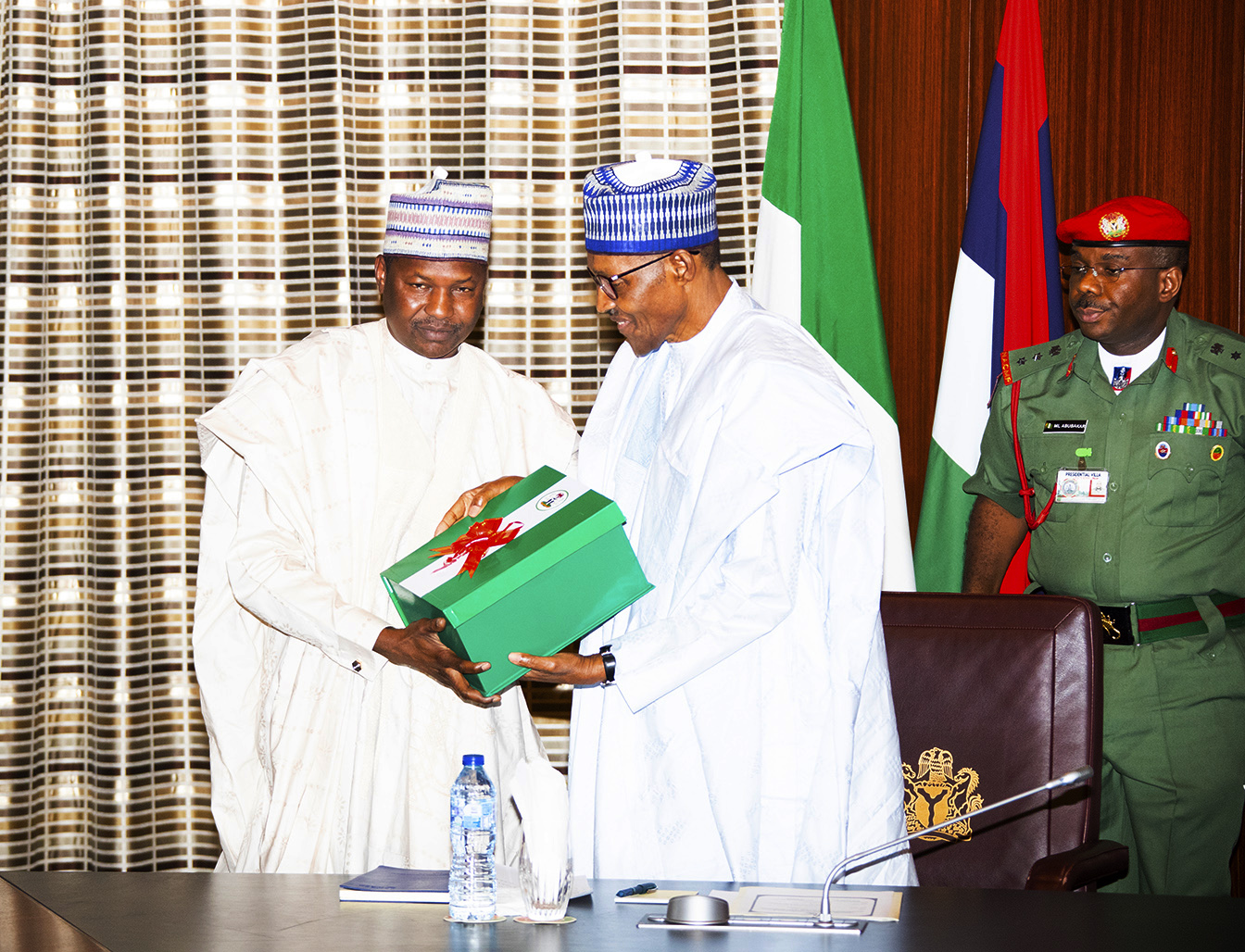 President Muhammadu Buhari received the report of Financial Autonomy for State Legislative and Judiciary from the immediate past Minister of Justice and Attorney General of the Federation, Abubakar Malami, at the State House, Abuja.
