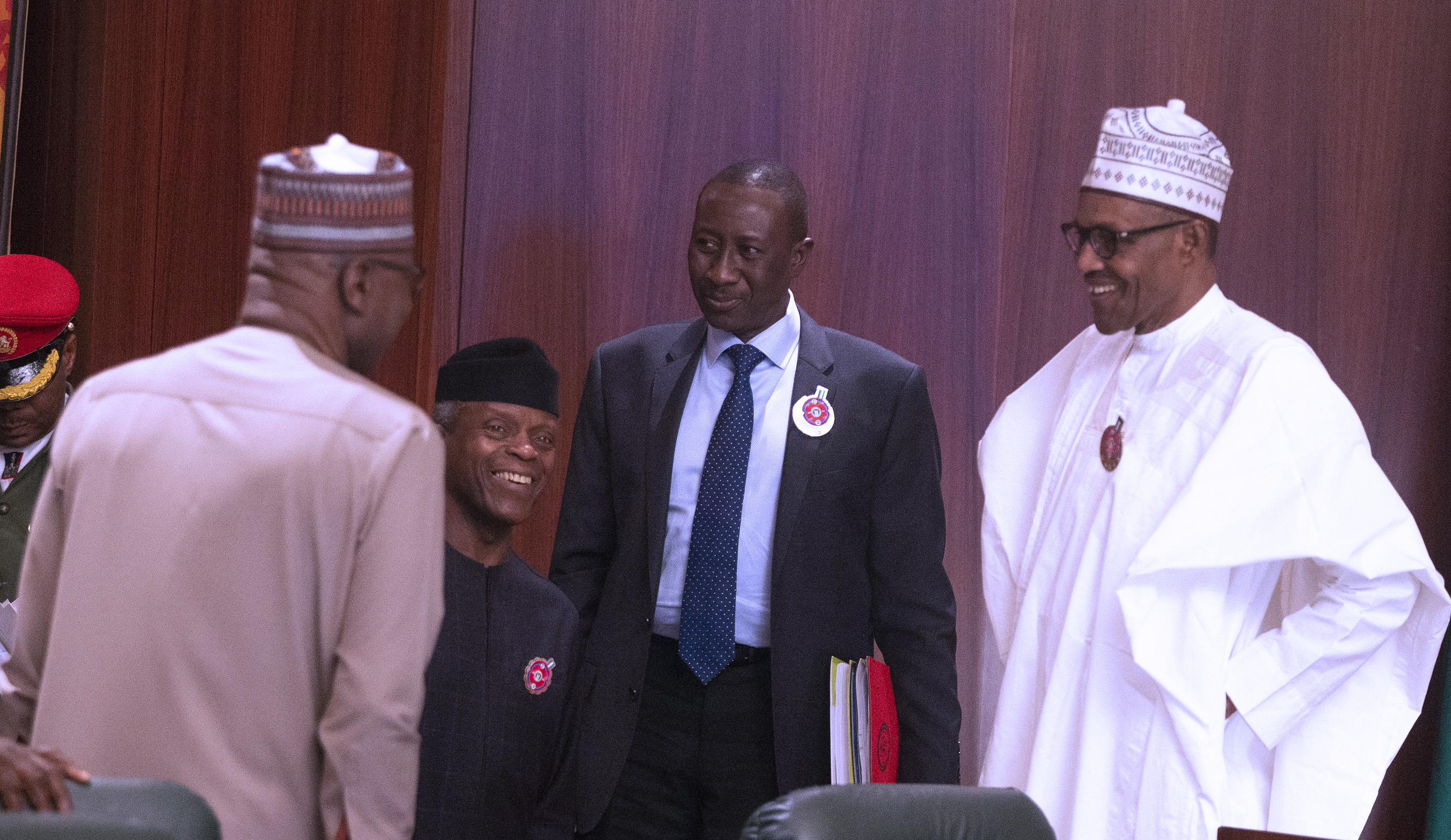 President Muhammadu Buhari and Vice President Yemi Osinbajo received participants of the National Institute of Policy and Strategic Studies (NIPSS), Kuru Senior Executive Course 40, at the Council Chambers, State House, Abuja. Present were: Minister of Industry, Trade, and Investment, Okeychukwu Enelamah, and Service Chiefs.